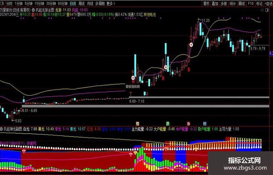 3、副图中蓝龙、红龙均大于白龙为黄色柱,可视为强势特征,一般很容易出现一波上涨行情,同时还包含主散能量的轮动变化。
