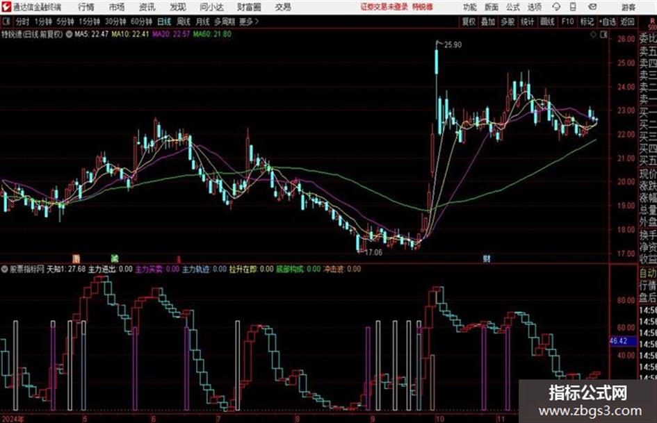 天知1: 3*SMA((CLOSE-LLV(LOW,27))/(HHV(HIGH,27)-LLV(LOW,27))*100,5,1)-2*SMA(SMA((CLOSE-LLV(LOW,27))/(HHV(HIGH,27)-LLV(LOW,27))*100,5,1),3,1);STICKLINE(REF(天知1,1) >天知1, 天知1,REF(天知1,1),8,1),colorcyan ;STICKLINE(REF(天知1,1)<天知1, 天知1,REF(天知1,1),8,1), colorred;ABV:=MA(SUM(IF(CLOSE>REF(CLOSE,1),VOL,IF(CLOSE<REF(CLOSE,1),-VOL,0)),0)/25000,2);M1:=EMA(ABV,12);M2:=EMA(ABV,26);MTM:=CLOSE-REF(CLOSE,1);MMS:=((100)*(EMA(EMA(MTM,6),6)))/(EMA(EMA(ABS(MTM),6),6));MMM:=((100)*(EMA(EMA(MTM,12),12)))/(EMA(EMA(ABS(MTM),12),12));MML:=((100)*(EMA(EMA(MTM,26),26)))/(EMA(EMA(ABS(MTM),26),26));mtgj:=C-REF(C,1);ZLGJ:=100*EMA(EMA(mtgj,9),9)/EMA(EMA(ABS(mtgj),9),9);MAZL:=MA(ZLGJ,5);A:=((VOL)/(CAPITAL))*(100);S:=((MA(A,30))/(MA(INDEXA,10)))*(MA(INDEXA,60));Y:=((MA(A,120))/(MA(INDEXA,10)))*(MA(INDEXA,60));X:=1;V1:=(HIGH+OPEN+LOW+(2)*(CLOSE))/(5);V2:=REF(V1,1);V3:=MAX(V1-V2,0);V4:=ABS(V1-V2);V5:=SMA(V3,10,1);V6:=SMA(V4,10,1);V8:=COUNT(((V5)/(V6)<0.2),5);V9:=COUNT((LLV(V1,10)=V1),10);主力进出:IF((MMS>REF(MMS,1) AND ZLGJ>REF(ZLGJ,1) AND CROSS(ABV,M2) AND ABV>REF(ABV,1) AND M1>REF(M1,1) AND M2>REF(M2,1)),65,0),colorwhite,POINTDOT;主进主轨:=ABV>M2 AND CROSS(ABV,M1) AND CROSS(ZLGJ,MAZL);STICKLINE(主力进出 OR 主进主轨,65,0,4,1),colorwhite;精准买卖:=V8>=1 AND V9>=1 AND CLOSE>OPEN AND REF(CLOSE,1)>REF(OPEN,1) AND (VOL>REF(VOL,1)) AND MMS>MML AND CROSS(ABV,M2);短线买点:=V8>=1 AND V9>=1 AND CLOSE>OPEN AND REF(CLOSE,1)>REF(OPEN,1) AND (VOL>REF(VOL,1)) AND CROSS(MMS,MML) AND ABV>REF(ABV,1);中线买点:=V8>=1 AND V9>=1 AND CLOSE>OPEN AND REF(CLOSE,1)>REF(OPEN,1) AND (VOL>REF(VOL,1)) AND ABV>REF(ABV,1) AND MMS>MML AND CROSS(MMM,MML) AND MMS>REF(MMS,1) AND MMM>REF(MMM,1) AND MML>REF(MML,1);主进主买:=ABV>M2 AND ZLGJ>MAZL AND CROSS(MMS,MML) AND MMS>REF(MMS,1) AND MMM>REF(MMM,1) AND MML>REF(MML,1);短中精:=精准买卖 OR 短线买点 OR 中线买点 OR 主进主买;主力买卖:IF(短中精,60,0),COLORFF00FF,POINTDOT;STICKLINE(主力买卖,60,0,4,1),COLORFF00FF;主力轨迹:IF(ABV>M2 AND MMS>MML AND CROSS(ZLGJ,MAZL) AND ZLGJ>REF(ZLGJ,1) AND MAZL>REF(MAZL,1),55,0),COLORFFCC66,POINTDOT;STICKLINE(主力轨迹,55,0,4,1),COLORFFCC66;拉升在即:IF(S<X AND Y<X AND MMS>MML AND ABV>M1 AND CROSS(S,Y),50,0),coloryellow,POINTDOT;STICKLINE(拉升在即,50,0,4,1),coloryellow;底部构成:IF(V8>=1 AND V9>=1 AND CLOSE>OPEN AND REF(CLOSE,1)>REF(OPEN,1) AND VOL>REF(VOL,1) AND ABV>M2 AND ZLGJ>MAZL,45,0),COLOR00FF00,POINTDOT;STICKLINE(底部构成,45,0,4,1),COLOR00FF00;ROC:=(CLOSE-REF(CLOSE,12))/REF(CLOSE,12)*100;HSL:=100*VOL/CAPITAL;冲击波:IF(CROSS(ROC,16) AND HSL>3.5,40,0),COLOR0099FF,POINTDOT;STICKLINE(冲击波,40,0,4,1),COLOR0099FF;
