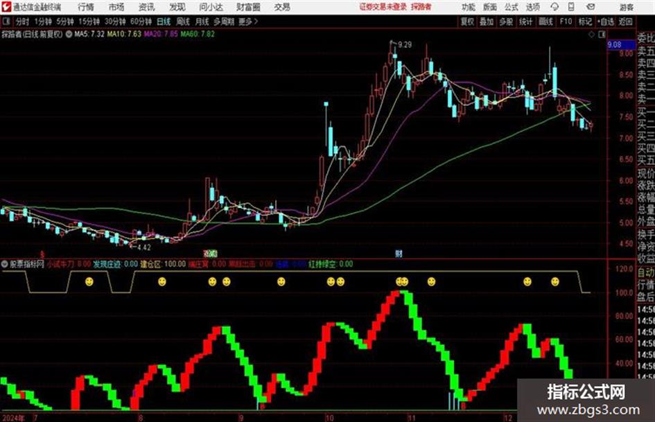 N:=5;N1:=21;VAR1:=4*SMA((CLOSE-LLV(LOW,N))/(HHV(HIGH,N)-LLV(LOW,N))*100,5,1)-3*SMA(SMA((CLOSE-LLV(LOW,N))/(HHV(HIGH,N)-LLV(LOW,N))*100,5,1),3.2,1);小试牛刀: IF(CROSS(VAR1,8),8,0),STICK,colorred;DRAWICON(小试牛刀>0,8,7);发现庄迹: IF(VAR1<=8,15,0),STICK,colorcyan,LINETHICK2;VARO5:=LLV(LOW,27);VARO6:=HHV(HIGH,34);VARO7:=EMA((CLOSE-VARO5)/(VARO6-VARO5)*4,4)*25;建仓区: IF((VARO7<10),100,118) ,COLOR00CCFF,LINETHICK1;CD1:=(HHV(H,9)-C)/(HHV(H,9)-LLV(L,9))-0.7;CD2:=(C-LLV(L,9))/(HHV(H,9)-LLV(L,9));CD3:=SMA(SMA(CD2,3,1),3,1);CD4:=(CD3-SMA(CD1,9,1))-0.5;CD5:=IF(CD4>0.00,CD4,0.00);CD6:=REF(CD5,1);VAR81:=MA(C,9);空头1:=IF(CD6-CD5,CD6,CD5);VAR1A:=(HHV(HIGH,9)-CLOSE)/(HHV(HIGH,9)-LLV(LOW,9))*100-70;VAR2A:=SMA(VAR1A,9,1)+100;VAR3A:=(CLOSE-LLV(LOW,9))/(HHV(HIGH,9)-LLV(LOW,9))*100;VAR4A:=SMA(VAR3A,3,1);VAR5A:=SMA(VAR4A,3,1)+100;VAR6A:=VAR5A-VAR2A;端庄窝:IF(VAR6A>N1,VAR6A-N1,0),colorred;果断出击:IF(CROSS(端庄窝,0.01),18,0),STICK,COLOR0000CC,LINETHICK2;DRAWICON(果断出击>0,18,7);XG:=CROSS(端庄窝,0.01);选底:IF(XG=1,16,0),STICK,LINETHICK3;LC:=REF(CLOSE,1);RSI:=SMA(MAX(CLOSE-LC,0),6,1)/SMA(ABS(CLOSE-LC),6,1)*100;E:=CROSS(83,RSI);减仓空仓:=CROSS(CD6,CD5) OR E;DRAWICON(减仓空仓>0,113,5);STICKLINE(REF(端庄窝,1)<端庄窝,端庄窝,REF(端庄窝,1),7,0),colorred;STICKLINE(REF(端庄窝,1)>端庄窝,端庄窝,REF(端庄窝,1),7,0),COLOR00FF00;红持绿空:0,colorgreen;
