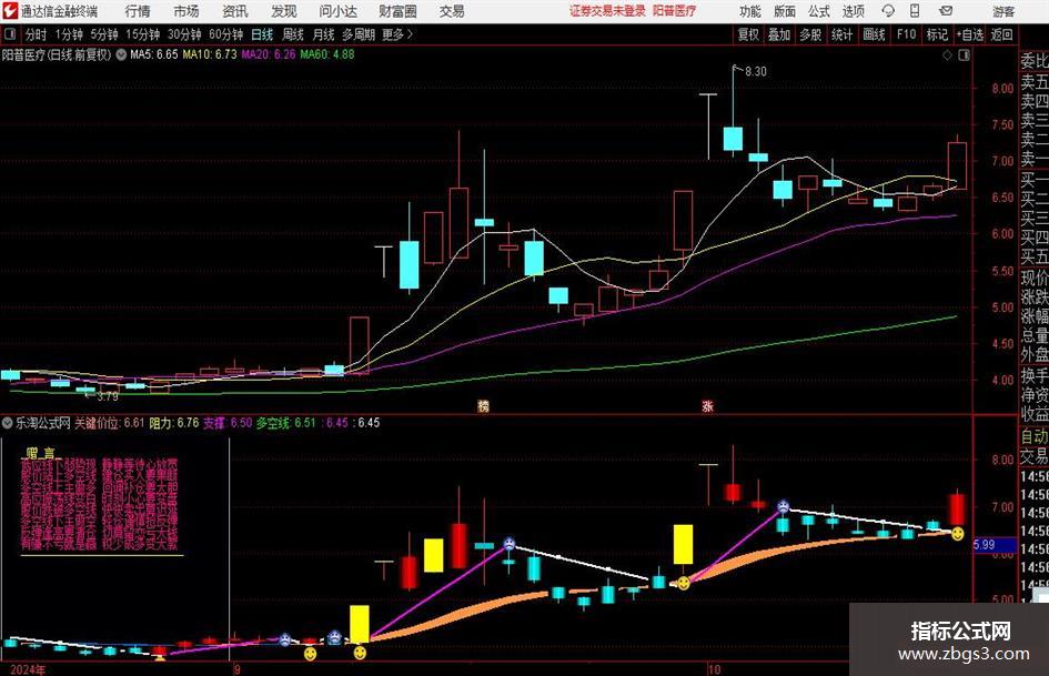 6、 针对科创板和创业板股票(以及满足特定日期条件的股票),在日线图上特别标记20%涨停和跌停的K线。对于其他股票,则标记10%涨停和跌停的K线。涨停K线用黄S色表示,跌停K线用蓝色表示。若涨停未封板或跌停被撬开,则分别用洋红色和淡蓝色标记。