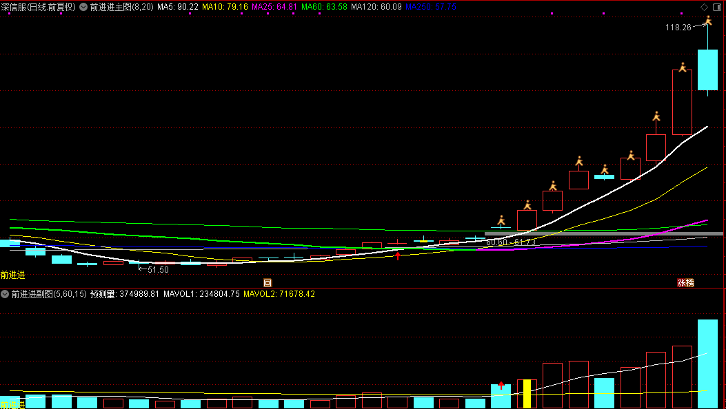 副图中的黄色柱体—-表示5日均量上穿60日均量,起提示作用。