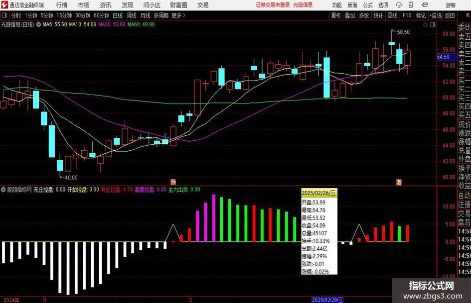 当满足条件VAR2>50ANDCOST(85)0时,在控盘和0位置之间画柱状线,宽度为1,0不为0则画空心柱.,COLORFF00FF