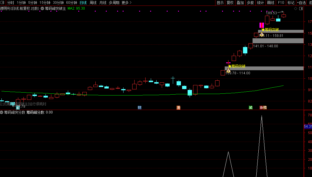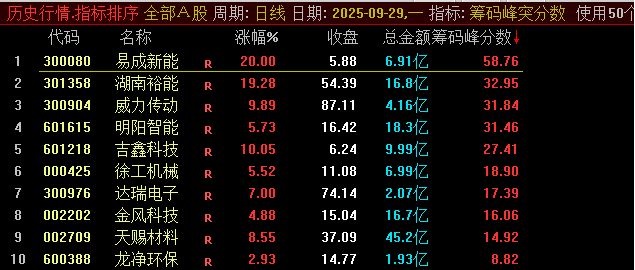 筹码峰突破指标因数据调用量大导致选股速度较慢,故改用排序功能显示分数,既可用于附图也能直接筛选。分数越高代表信号越强。