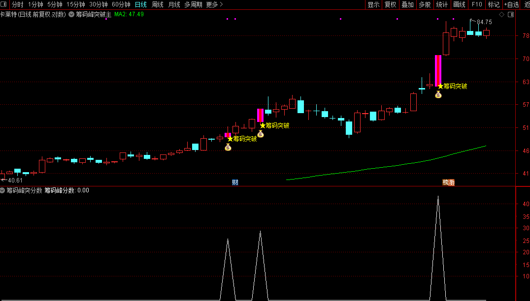 通达信2025【筹码峰突破+筹码峰突分数】识别股价突破筹码密集区的信号排序源码