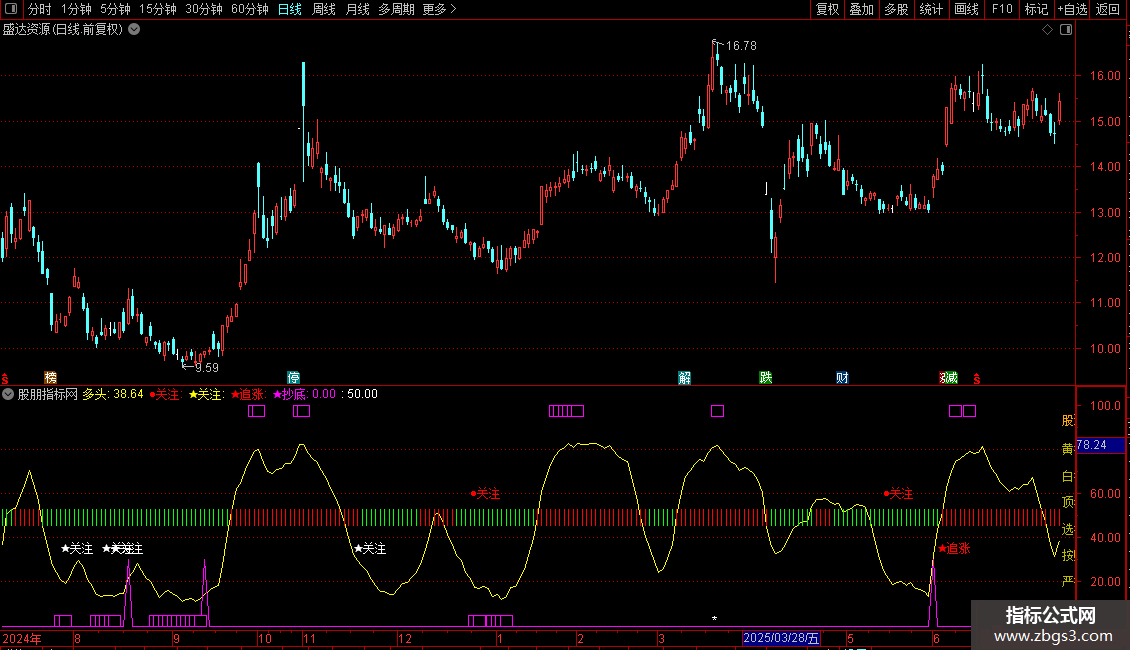 ★关注: DRAWTEXT(REF(CROSS(慢线,多头),82) AND 慢线>1.3*多头,35,'★关注'),LINETHICK1;