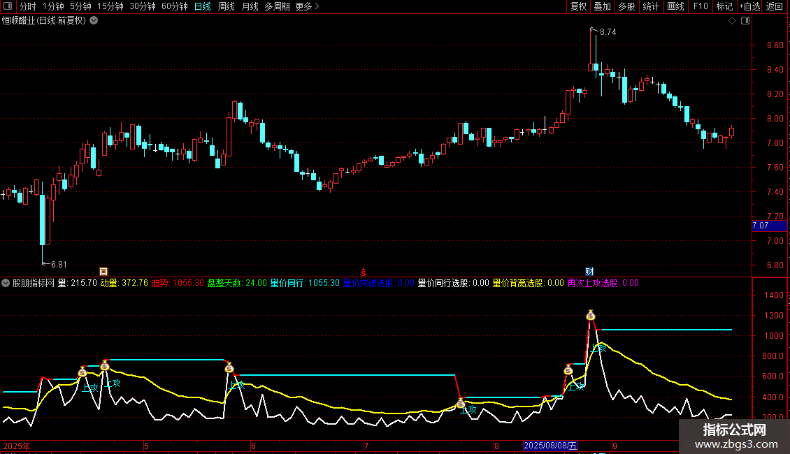 量价突破选股:IF(((((量 = 趋势) AND (CLOSE > REF(CLOSE, 1))) AND (量 > REF(量, 1))) AND (REF(A08, 2) > 0)), 888,0),LINETHICK0;
