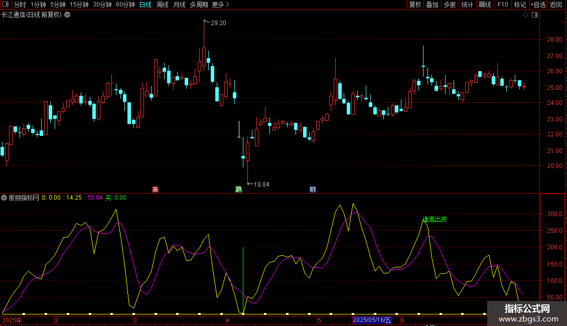 MMM赋值:(HHH的2日简单移动平均*3+HHH*13)/16,COLORFF00FF,线宽为1