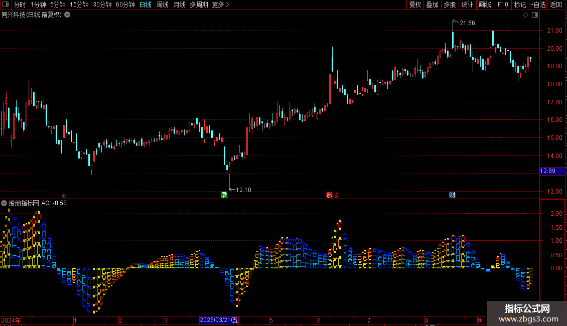 STICKLINE(AO>=REF(AO,1),(AO-AO*0.6),(AO-AO*0.75),5,-1) COLOR00CCFF;