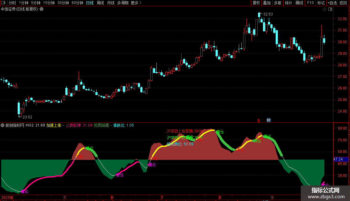 上涨趋势:=IF(HG1>50,HG1,DRAWNULL),COLORRED;