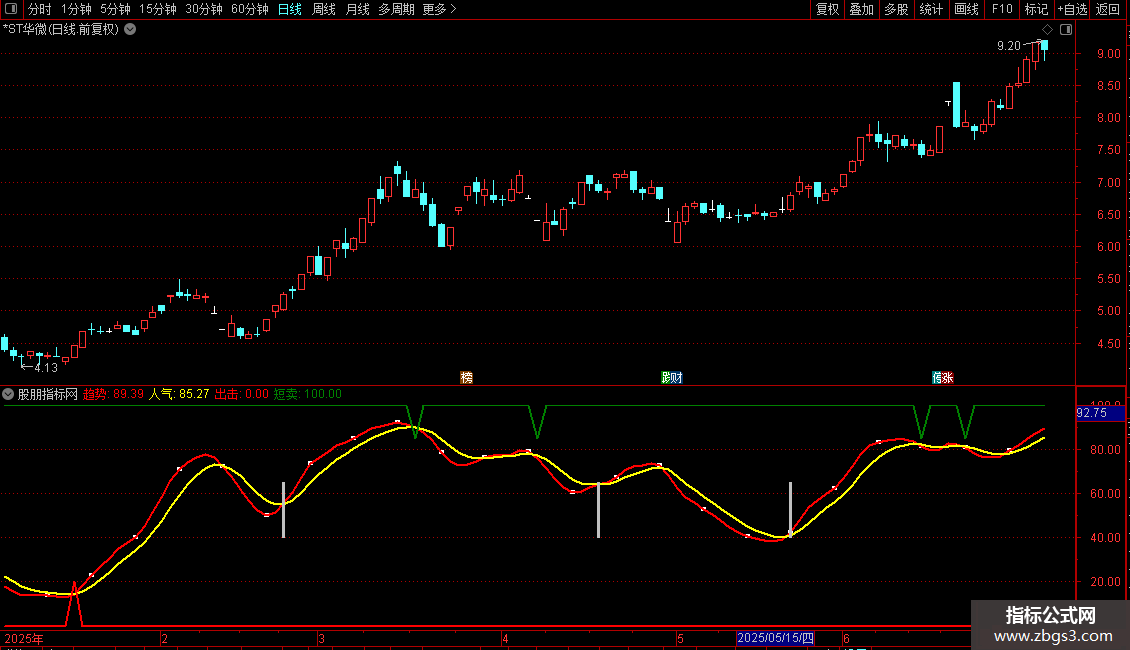 短卖:IF(CROSS(人气,趋势) AND (人气>75),85,100),COLOR008000,LINETHICK2;