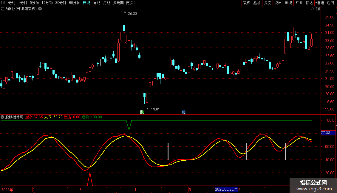 出击:IF(CROSS(趋势,人气) AND (趋势<30),20,0),COLOR0000FF,LINETHICK2;