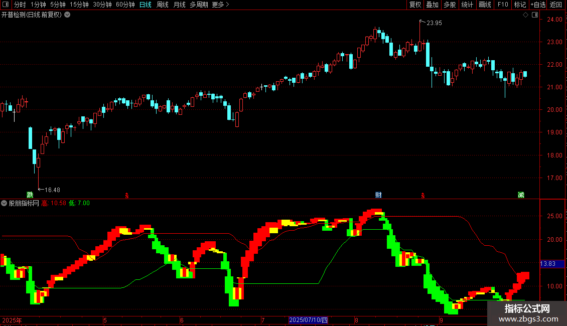 介必升:=(CLOSE-LLV(LOW,21))/(HHV(HIGH,21)-LLV(LOW,21))*1.2*CLOSE;老介1:=EMA(介必升,4);老介2:=EMA(介必升,6);老介3:=EMA(介必升,8);STICKLINE(老介1>=老介2,老介3,老介1,8,0),colorred;STICKLINE(老介1>=老介2,老介3,REF(老介1,1),5,0),colorred;STICKLINE(老介1<老介2,老介3,老介1,8,0),colorgreen;STICKLINE(老介1<老介2,老介3,REF(老介1,1),3,0),colorgreen;T1:=老介2>=老介3 AND 老介1<REF(老介1,1);T2:=老介2<老介3 AND 老介1>REF(老介1,1);STICKLINE(T1,老介1,老介3,8,0),COLOR00FFFF;STICKLINE(T1,老介1,REF(老介3,1),3,0),COLOR00FFFF;STICKLINE(T2,老介1,老介3,8,0),coloryellow;STICKLINE(T2,老介1,REF(老介3,1),3,0),colorred;高:HHV(EMA(介必升,13),21),colorred,Linethick1;低:LLV(EMA(介必升,10),21),colorgreen,Linethick1;