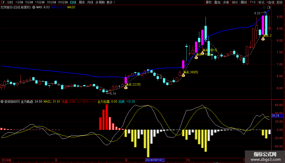 洗盘:IF(主力跟踪5>REF(主力跟踪5,1),主力跟踪5,0),COLORRED,NODRAW;