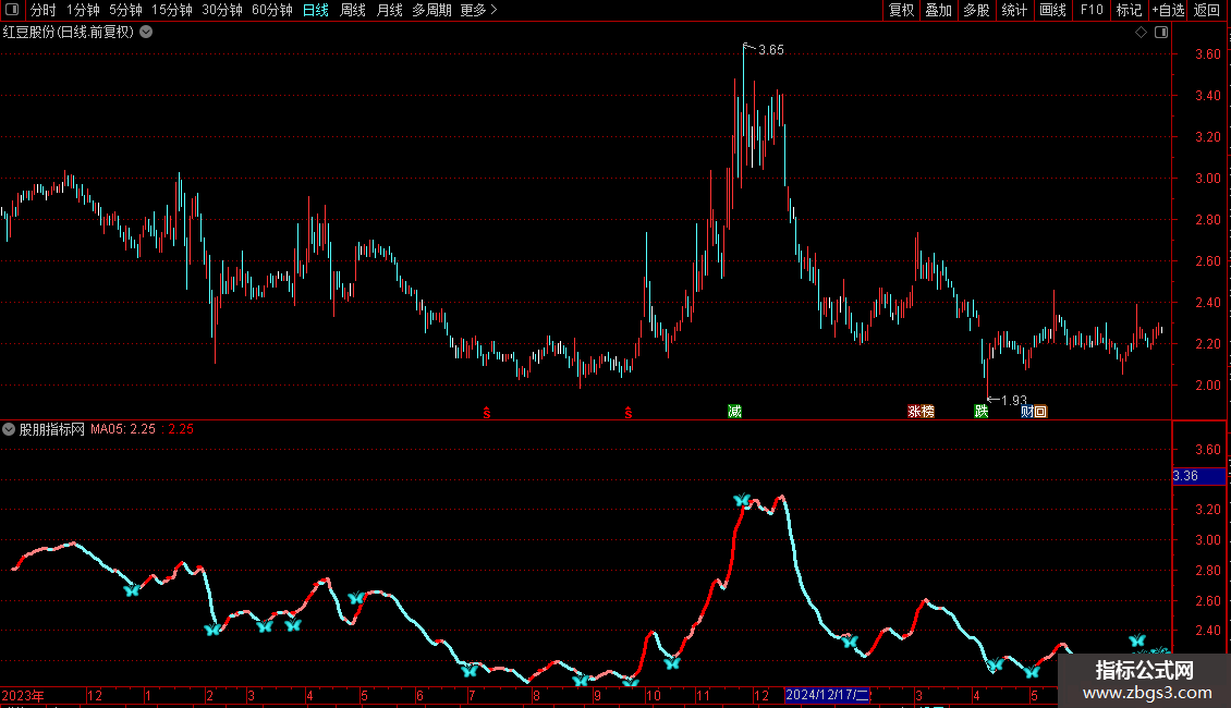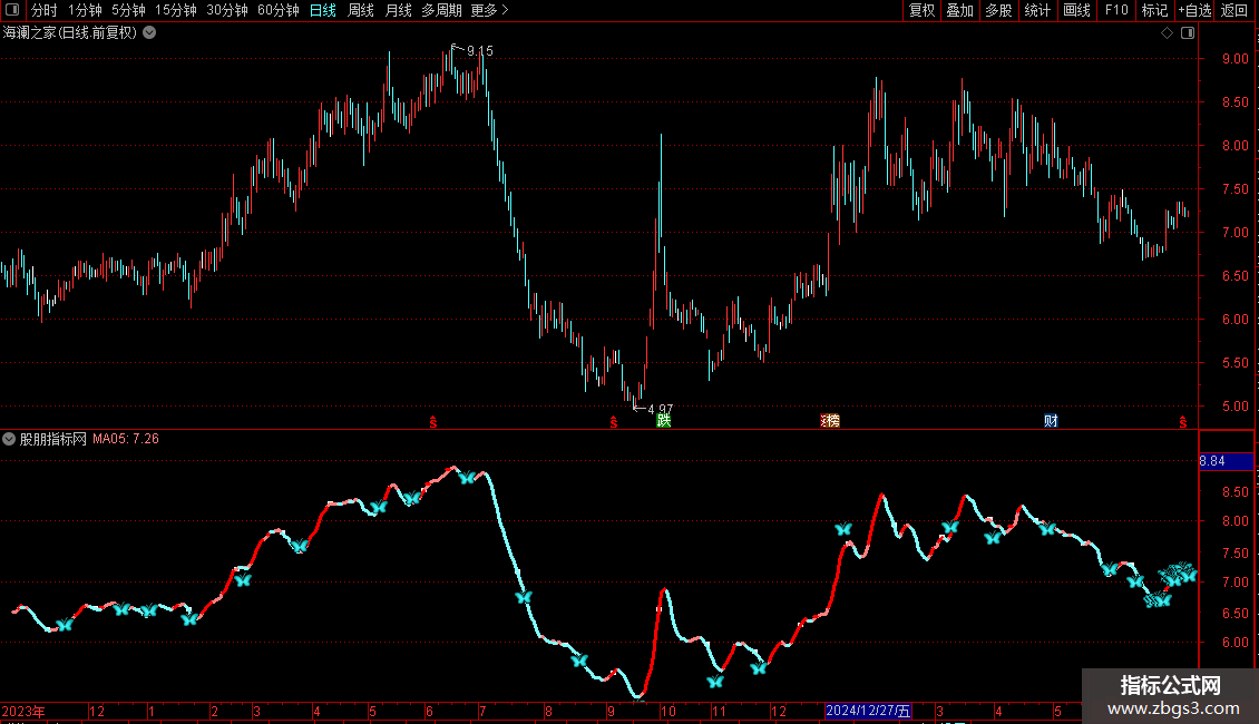 IF(X_5<0 AND MA05<REF(MA05,1),MA05,DRAWNULL),COLORFFFF80,LINETHICK3;