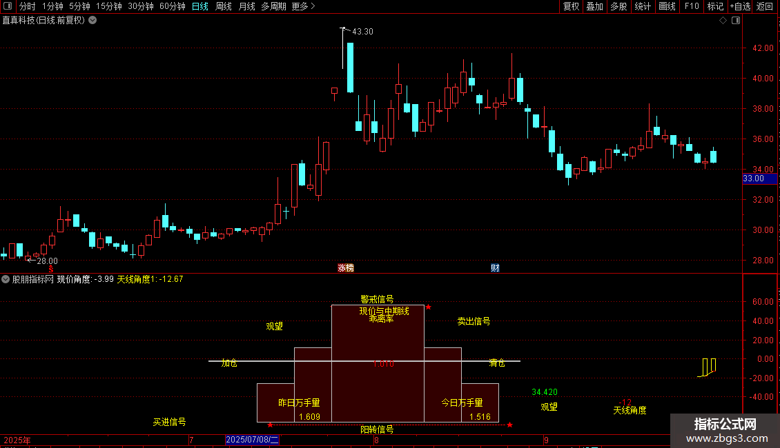 当满足条件到最后交易的周期<3时,在天线角度和0位置之间画柱状线,宽度为2,1不为0则画空心柱.,画黄色