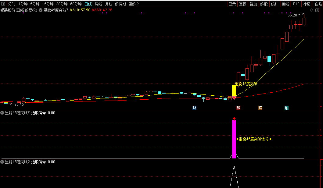 通达信【量能45度突破】主副/选指标短期趋势加速型共振指标价格趋势陡峭度源码