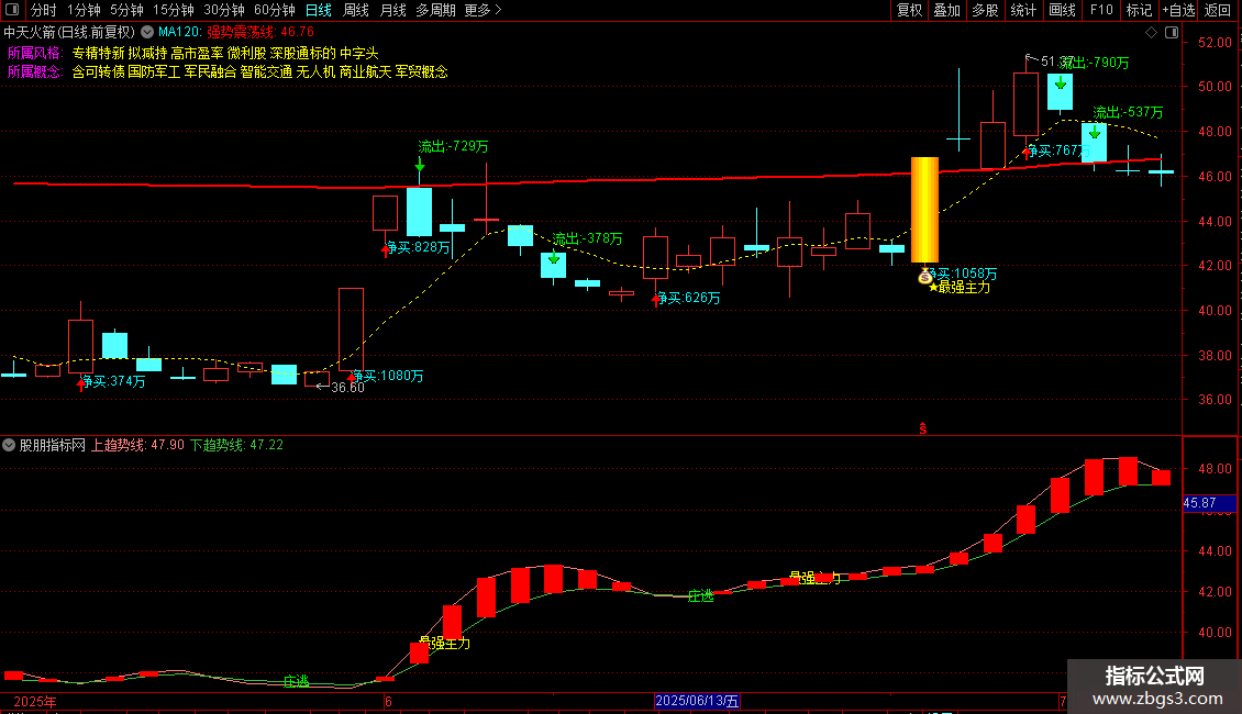 DRAWTEXT(净流入< -300 AND 涨跌幅<=-3,H*1.01,VARCAT(VARCAT('流出:',VAR2STR(净流入,0)),'万')),COLORGREEN;