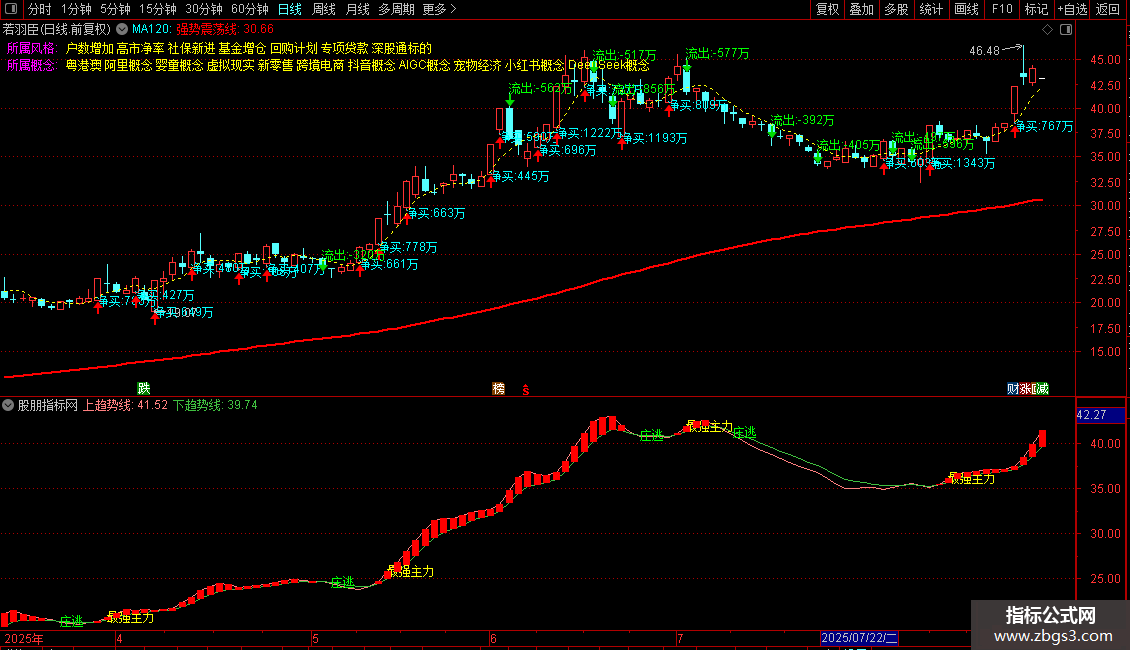 DRAWTEXT(净流入>=300 AND 涨跌幅>=4,L*0.995,VARCAT(VARCAT('净买:',VAR2STR(净流入,0)),'万')),COLORCYAN;
