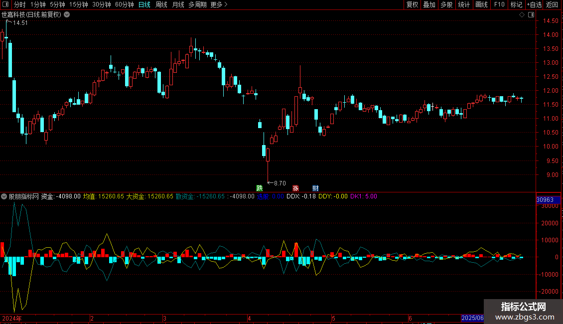 散资金:-SUM(资金,5),COLORLICYAN,LINETHICK1;