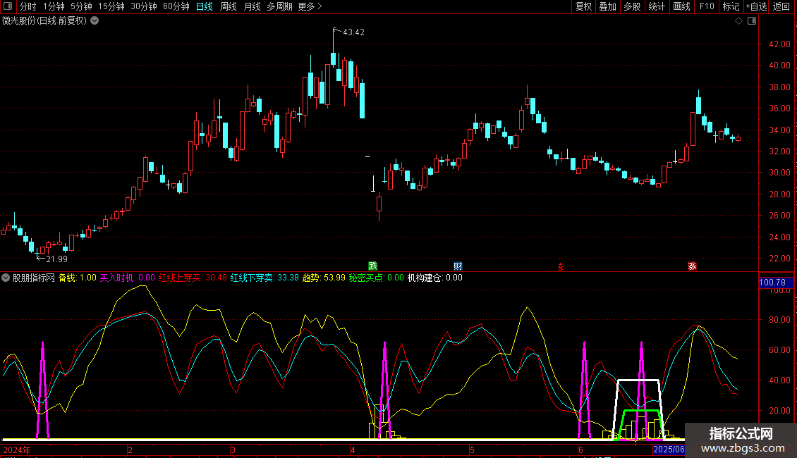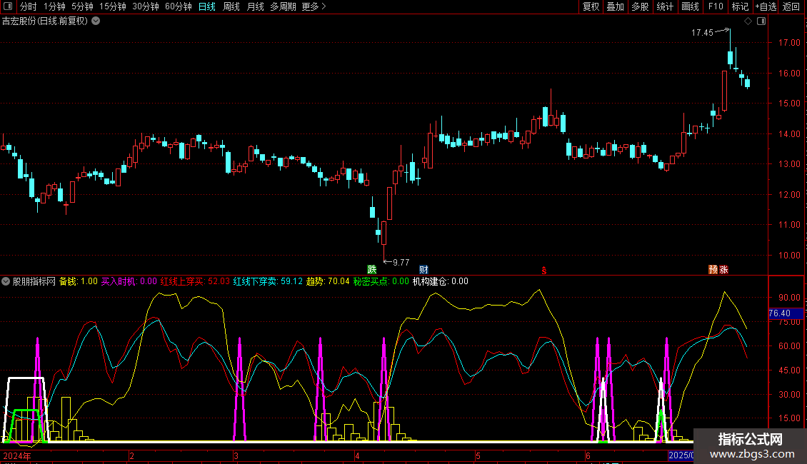 买入时机: IF(CROSS(J,3),65,0),COLORFF00FF,LINETHICK3;