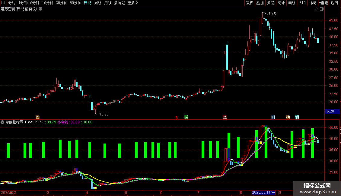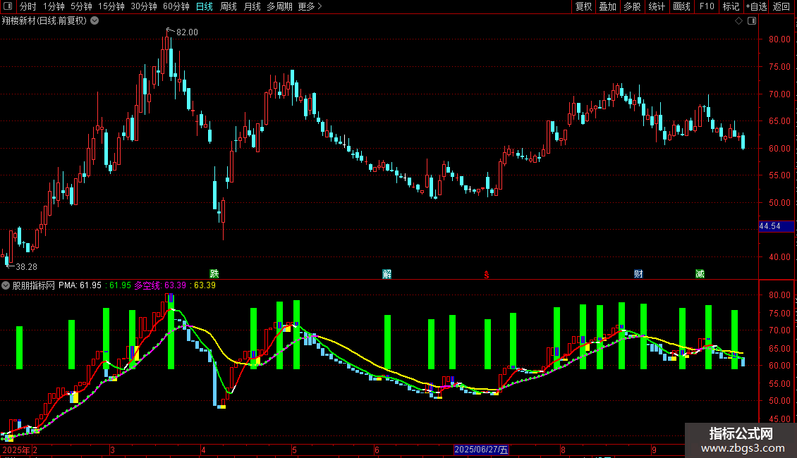 多空线:(20*X+19*REF(X,1)+18*REF(X,2)+17*REF(X,3)+16*REF(X,4)+15*REF(X,5)+14*REF(X,6)