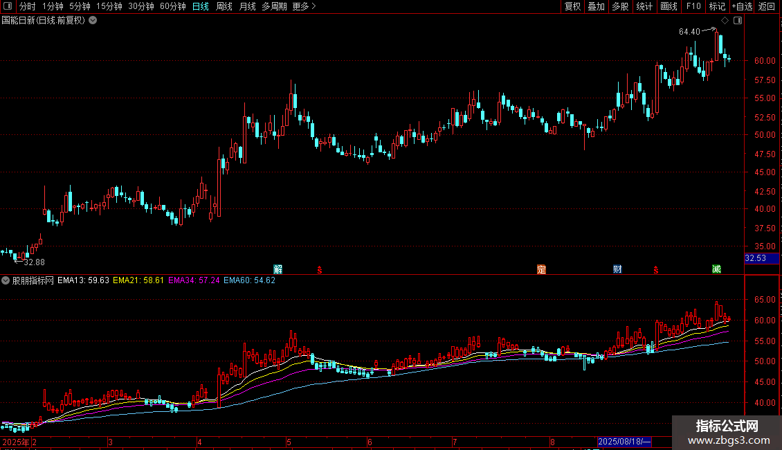STICKLINE(X2<X3 AND C<EMA13,CLOSE,OPEN,3,0),COLORFFFF52;