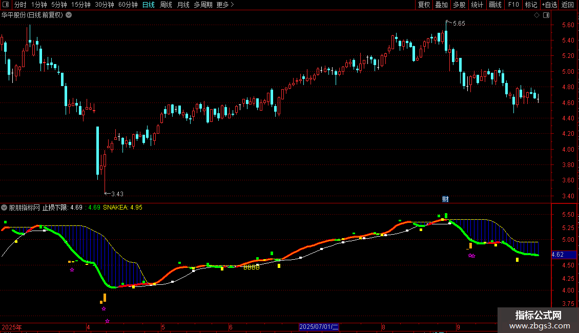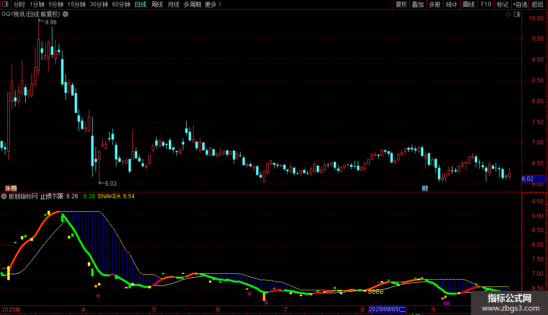 止损下限:IF(LLV(MA(B2,8),3)< B2,LLV(MA(B2,8),3),B2);