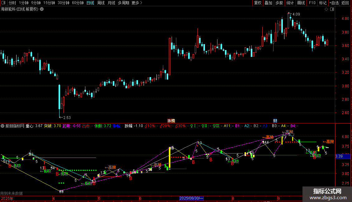 输出A3:当满足条件最高价>=34日内最高价的最高值时,在最高价位置画直线起点,当满足条件最低价<=34日内最低价的最低值时,在最低价位置画直线终点,0表示是否延长.