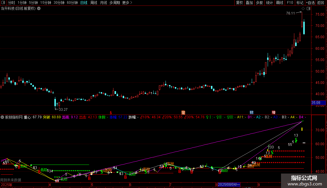 输出A4:当满足条件最高价>=55日内最高价的最高值时,在最高价位置画直线起点,当满足条件最低价<=55日内最低价的最低值时,在最低价位置画直线终点,0表示是否延长.