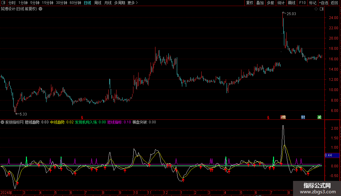 短线指标:IF(((((CROSS(短线趋势,中线趋势) AND (短线趋势 < 0)) AND (中线趋势 < (0 - 0.2)+4)) AND (VAR11 > 45)) AND (VAR16 > 0)),0.4,0.1),COLORMAGENTA;