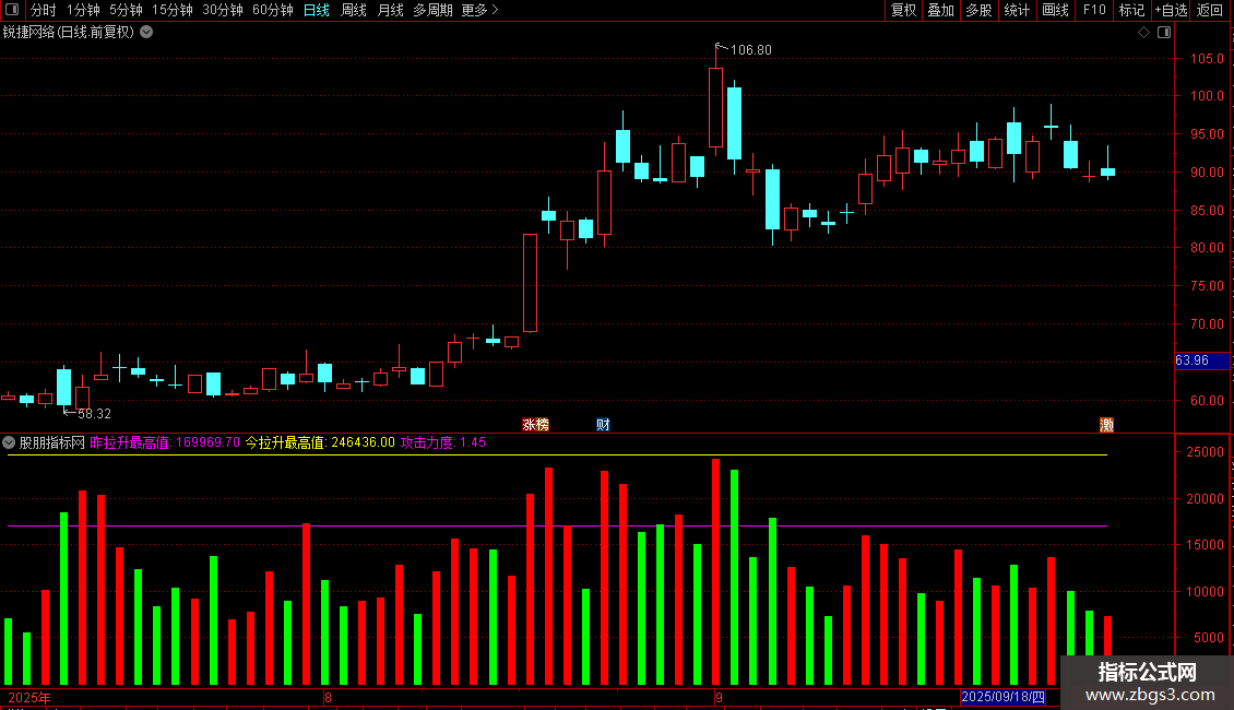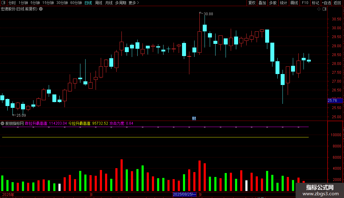 昨拉升最高值:CONST(REF(HHV(力度,FROMOPEN),239)),LINETHICK1,COLORMAGENTA;