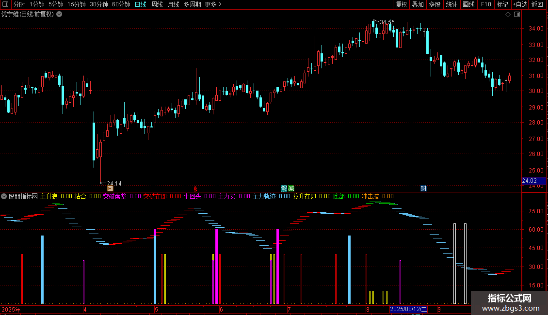 牛回头:IF(U3 OR U4,35,0),COLORFF00FF,POINTDOT;