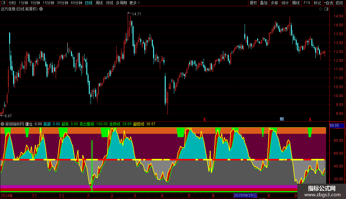 【底部侦测】副图,五层渐变色能量金字塔,独创“白-黄-绿”三级底部侦测信号