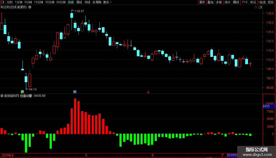 STICKLINE(控盘动量>0,控盘动量,0,2,0), COLORRED;