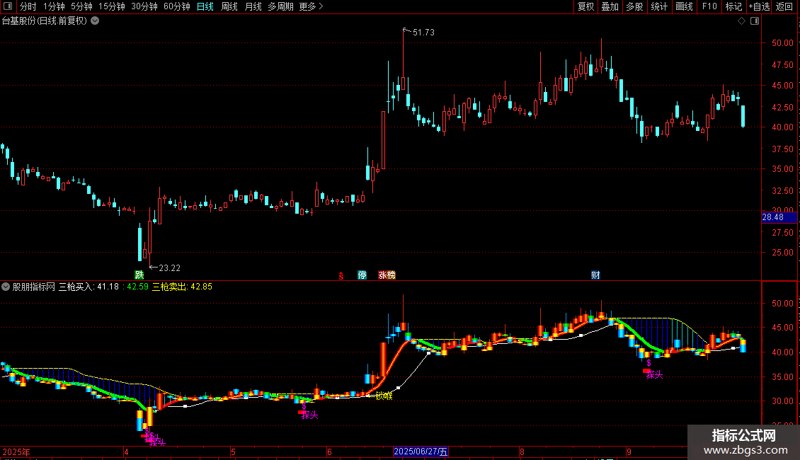 STICKLINE(三枪卖出>SMA2 AND B2<SMA2,三枪卖出,SMA2,0,1),COLORBLUE;