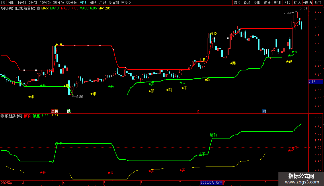 DRAWTEXT(CROSS(买线,卖线)AND 箱顶>=REF(箱顶,1),LOW*0.95,'★跟'),COLOR00FFFF;