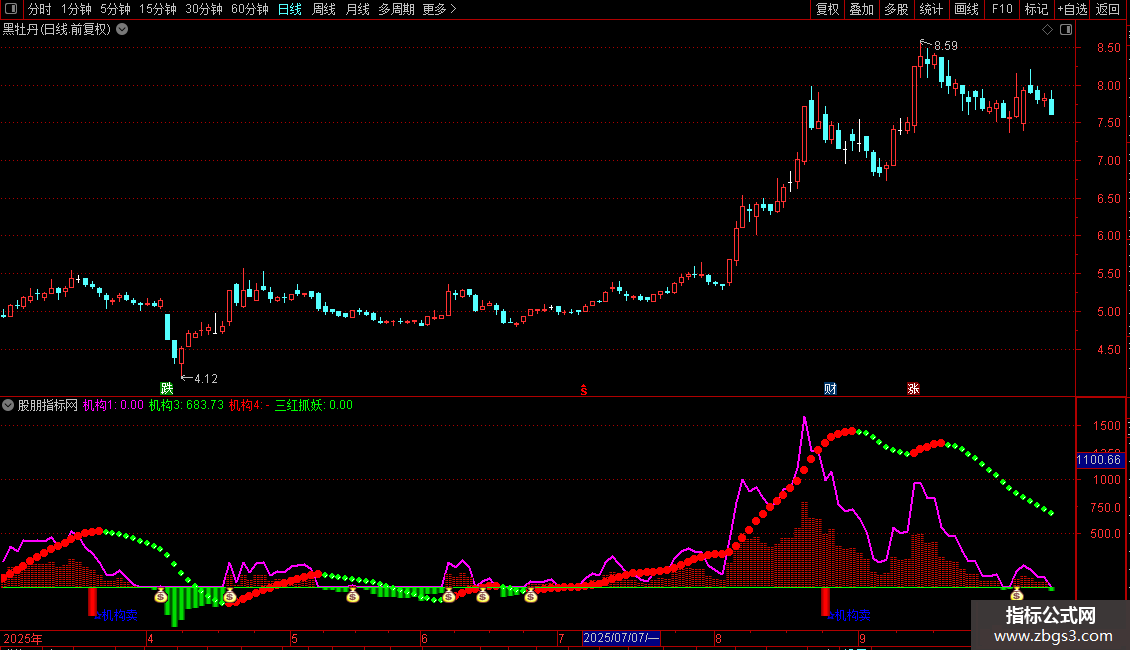 1. 机构1线(紫色):监测股价与30日均线偏离值