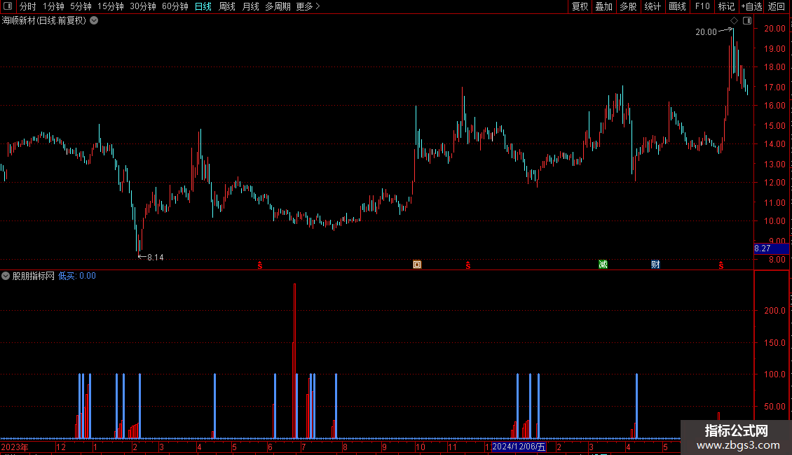 低买:IF((CROSS(洗盘,主力进场)AND 买入=-20),100,0),STICK,COLORFF9150,LINETHICK3;