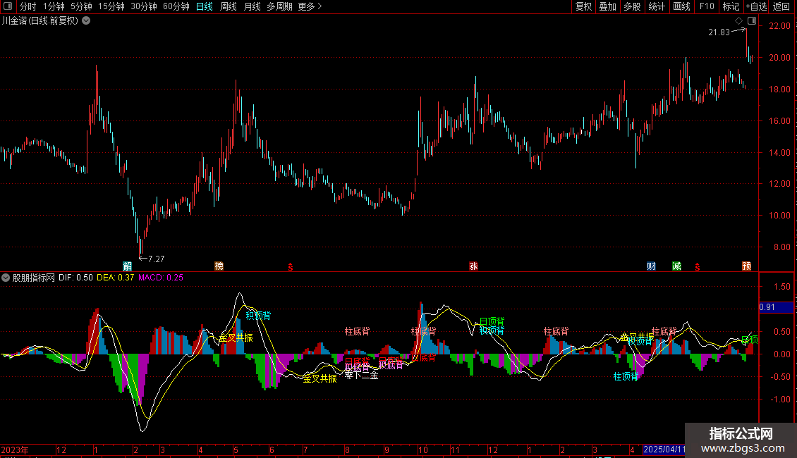 DRAWTEXT(顶背离,DIF*1.12,'日顶背'),COLORGREEN;