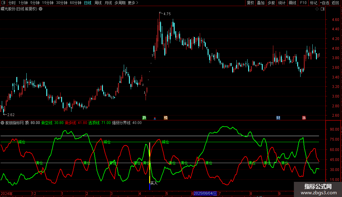 指标通过计算股价高低点位置判断趋势,做多线(红色)与做空线(绿色)交叉时发出信号,结合股价突破条件标记买入点,当股价触及逃顶线或强弱分界线时提示减仓/清仓。操作策略:做多线上穿做空线且满足条件时买入,做多线下破40线或上穿71线时减仓/清仓。