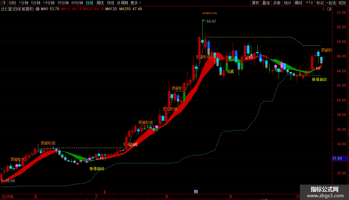 支撑:MA(REF(LLV(C,30),1),2),COLORABFF46,DOTLINE;