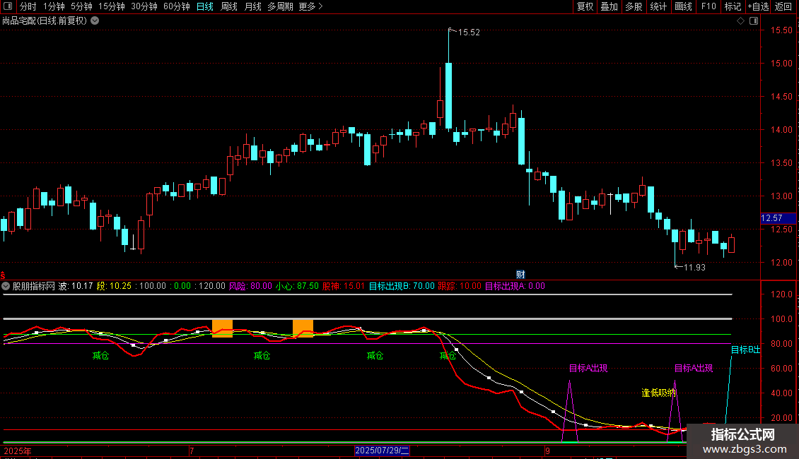 目标出现A:IF((COUNT((股神>REF(股神,1)),1)=1) AND (REF(股神,1)<REF(REF(股神,1),1)) AND (股神<跟踪),50,0),COLORF00FF0;