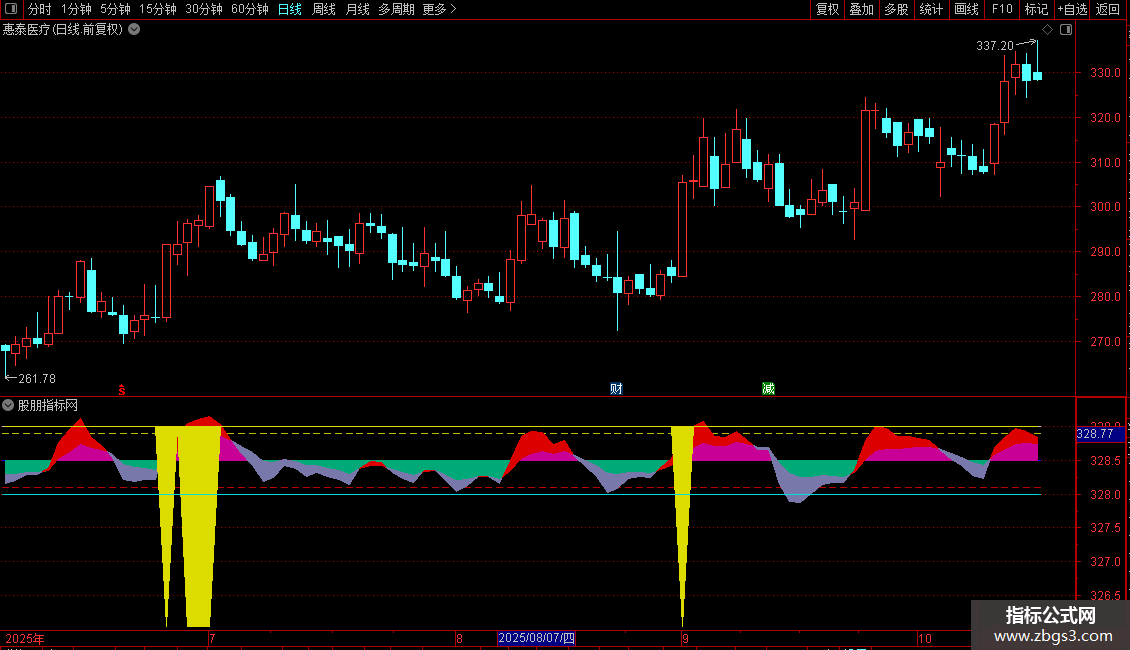 指标通过计算价格在特定周期内的相对位置,识别市场趋势和买卖信号。它在当前价格上下绘制多条水平参考线和彩色带状区域,直观展示支撑阻力位。当快线突破慢线时产生买入信号,下穿时则考虑卖出。