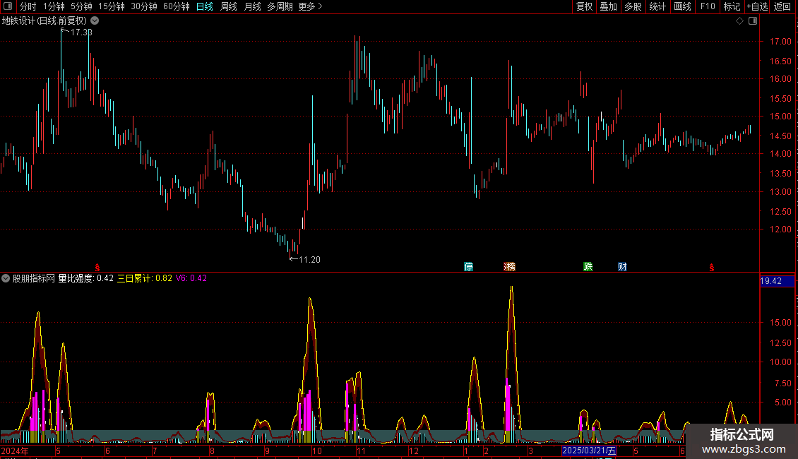 当粉红柱上穿棕黄柱且三日累计浮出灰色带时,有行情。