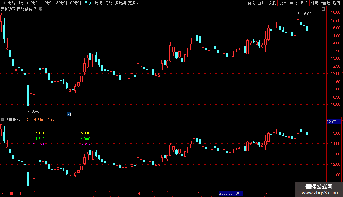 背景:DRAWGBK(C>0,RGB(0,0,0),RGB(0,0,0),0,'预测价',0); DRAWKLINE(H,O,L,C); {预测当天最低价公式} A1:=REF(O,1); A2:=ABS((REF(C,1)-A1)/A1); A3:=ABS((REF(H,1)-A1)/A1); A4:=ABS((REF(L,1)-A1)/A1); B1:=ABS((A2+A3+A4)/3); B2:=O*B1; 预测低一:=O-B2; 预测高一:=O+B2; 今日保护价:(REF(C,2)+REF(C,1)+O)/3 ,COLOR4080FF,NODRAW; 开盘价1:=OPEN; 开盘价2:=REF(OPEN,1); 最高价1:=HIGH; 最高价2:=REF(HIGH,1); 最低价1:=LOW; 最低价2:=REF(LOW,1); 收盘价1:=CLOSE; 收盘价2:=REF(CLOSE,1); AA:=最高价2; BB:=最低价2; CC:=开盘价2; DD:=收盘价2; EE:=(AA+BB+CC+2*DD)/5; AAA:=EE+(AA-BB); BBB:=2*EE-BB; CCC:=2*EE-AA; DDD:=EE-(AA-BB); 上升突破价:=AAA; 上升阻力价:=BBB; 下跌支撑价:=CCC; 下跌反转价:=DDD; EEE:=(EE+上升突破价+上升阻力价+下跌支撑价+下跌反转价)/5; 心理价:=EEE; FFF:=(EEE+开盘价1)/2; GGG:=(预测低一+FFF)/2; 预测低二:=GGG; {预测今日最高价公式} 预测高二:=MA(REF(HIGH,1)/REF(CLOSE,2),N)*REF(CLOSE,1); DRAWNUMBER_FIX(1,0.10,0.20,0,CONST(预测低一)),COLORGREEN; DRAWNUMBER_FIX(1,0.10,0.28,0,CONST(预测高一)),COLORMAGENTA; DRAWNUMBER_FIX(1,0.24,0.20,0,CONST(预测低二)),COLORGREEN; DRAWNUMBER_FIX(1,0.24,0.28,0,CONST(预测高二)),COLORMAGENTA; 买回价:=预测低二*1.015; 卖出价:=买回价*(1+PP); DRAWNUMBER_FIX(1,0.10,0.12,0,CONST(卖出价)),COLORYELLOW; DRAWNUMBER_FIX(1,0.24,0.12,0,CONST(买回价)),COLORYELLOW;