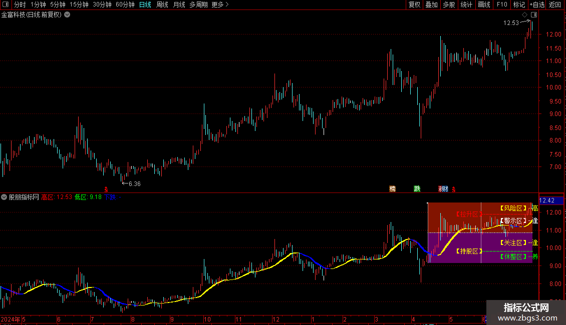 DRAWTEXT(CURRBARSCOUNT=N11/4+5,GD-KJ*0.09,'【风险区】--高抛避险'),COLOR00FFFF;