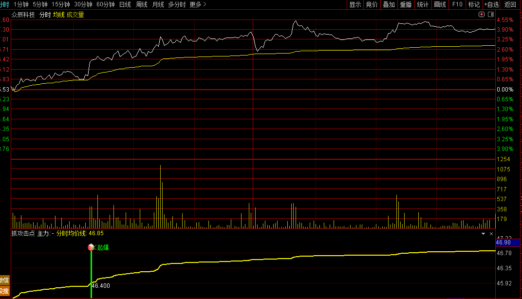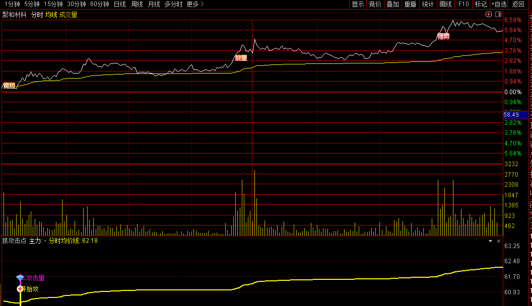 本指标专为捕捉盘中强势攻击信号设计,通过动态追踪资金流向与攻击动能,帮助投资者把握短线起涨点。核心功能包括实时监控资金进出强度、识别主力攻击量能变化,并结合价格走势判断买卖时机。当指标出现“开始攻击”“攻击量”等信号时,代表资金积极入场;而“量突破”“分时突破”则提示关键位置放量启动。此外,指标通过主力线与散户线的相对位置,直观显示资金博弈状态。适用于分时图分析,可在股价放量启动、资金同步流入时提供参考,辅助投资者在强势股拉升初期及时跟进。