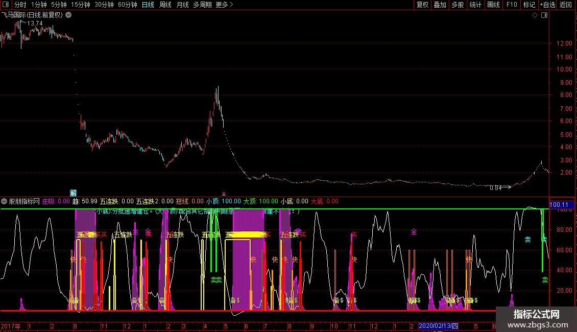 大顶:IF(CROSS(VAR14A,-95) AND VAR15A>=0.35,38,100),COLORGREEN,LINETHICK2;
