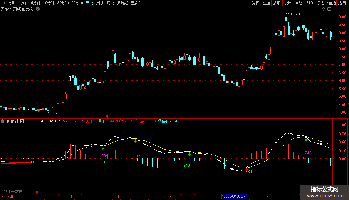 顶背:DRAWLINE(A2=0,DEA,顶背离,DEA,0),COLORGREEN,LINETHICK4;