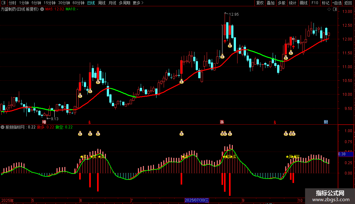 ◦ 副图共振:当副图中的红色量能柱出现,同时伴随钱袋子图标,与主图信号形成共振,这是趋势启动的进一步加强信号。